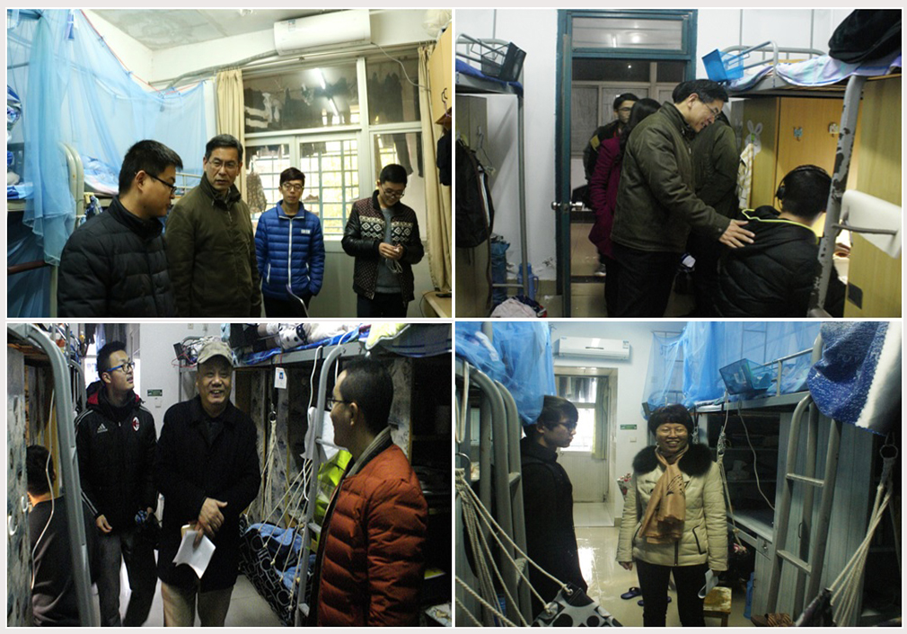 在走访检查过程中,联系该院班级的校党委副书记、纪委书记刘志远分别到热自141、151、161三个班级宿舍中与同学们进行了深入的交流,了解学生思想、学习动态,查看宿舍卫生及安全情况,并对学生宿舍安全问题、卫生情况、学风建设、文化建设等进行了现场指导。刘书记引导同学们要在平常的生活中,注意防寒保暖,注意财物安全、用水用电安全、人身安全,加强内务清洁管理,保持宿舍环境卫生。该院党委书记邓东华听取了学生对宿舍内各项生活服务设施使用管理的意见和建议,强调了宿舍安全的各项要求。教务处处长缪国钧勉励同学们勤奋学习、努力向上,加强锻炼,培养良好的生活习惯,营造良好的学习氛围,合理安排好考试季的学习和生活。