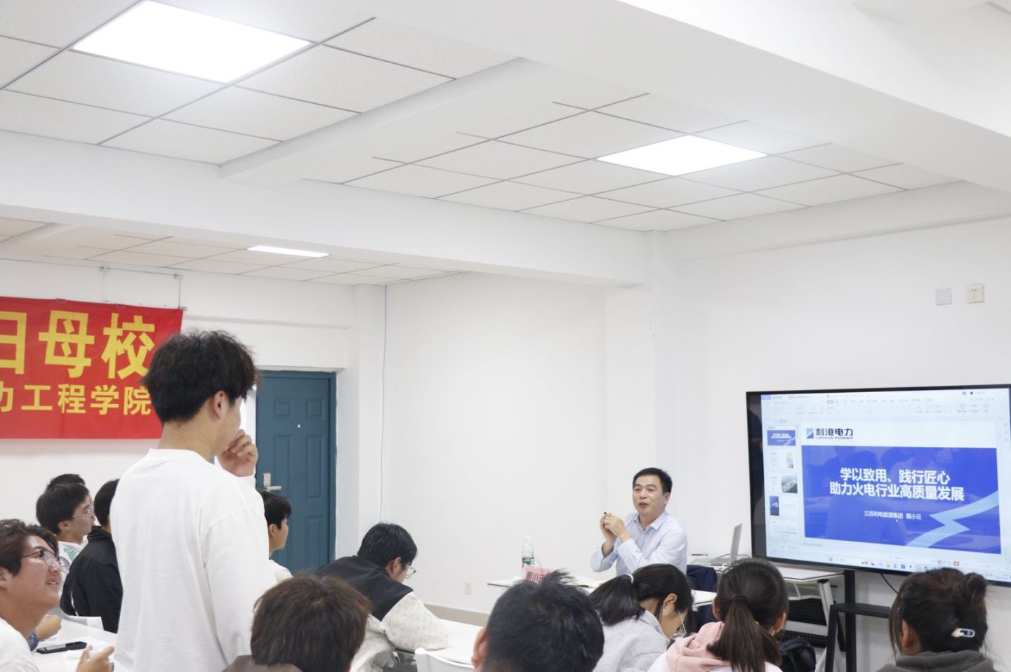 党委副书记朱正林主持。今年获评“江苏工匠”的江苏利电集团热动201001戴小云校友,曾多次被授予江阴市“有突出贡献高技能人才”、“太湖工匠”、“无锡大工匠”和“江苏省企业首席技师”等荣誉称号。他以“学以致用、践行匠心,助力火电行业高质量发展”为主题,分享了自己毕业后逐步成长为劳动模范的职业成长经历。他重点介绍了负责研发的“火力发电智能监盘系统”,通过大数据挖掘技术和人工智能技术有效解决了企业生产中的痛点问题,支持了企业甚至整个行业的高质量发展。在被问及“学生在校期间应该如何有效学习”这一问题时,戴小云强调了专业技能的重要性,鼓励在座的同学们要脚踏实地、勇于追梦、不畏挑战、坚持自我,为推动能源强国贡献青春力量。此外,他还受聘担任天天德州