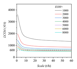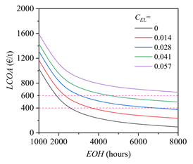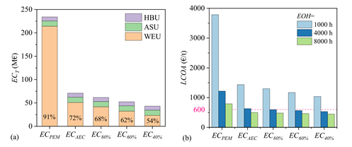 本文基于近期低压哈伯法催化剂的研究进展,融合氨/CO2制冷、先进压缩机、PSA分离等先进技术,研究了绿电驱动的低压哈伯法和超低压哈伯法合成氨的能量-碳排放-经济性表现。重点分析了电解水制氢的方法、能耗、压力,合成氨运行压力,电价,设备成本,工厂规模,年等效运行小时数等参数对能量效率、单位能耗、均化成本及其构成、生命周期碳排放和氨排放及其构成等指标的影响规律。结果表明,计入液氨冷能后,绿电到液氨的系统能效高达73.75%,相应的单位能耗仅为7.64 kWh/kg,展示出较高的能量转换效率。为了保障经济竞争力,合成氨工厂规模不宜小于10 t/h。基于当前常见的储能电价(约0.28 ¥/kWh),年等效运行小时数需要超过5000 h才能实现盈利。因此,在商业模式方面,建议哈伯法绿氨工厂的建设和运营,兼顾化工生产和绿电储能两种功能,从而提高年等效利用小时数,实现经济盈利。仅用于储能的绿氨工厂很难有经济竞争力,不是优选的发展模式。基于中国风电的生命周期碳排放和氨排放强度仅为257–316 kgCO2e/t和0.06 kgNH3/t,相比天然气和煤制氨,碳减排幅度分别高达82%和91%,显示出巨大的低碳清洁优势。绿氨的减碳效益显著,但经济竞争力不强,未来需要引入碳减排收益或者其他政策补贴。