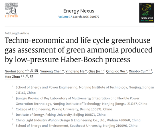 为第一署名单位,在国际期刊《Energy Nexus》发表题为“Techno-economic and life cycle greenhouse gas assessment of green ammonia produced by low-pressure Haber-Bosch process”的学术论文。《Energy Nexus》是WOS一区,中科院二区期刊,首个影响因子为8.1。