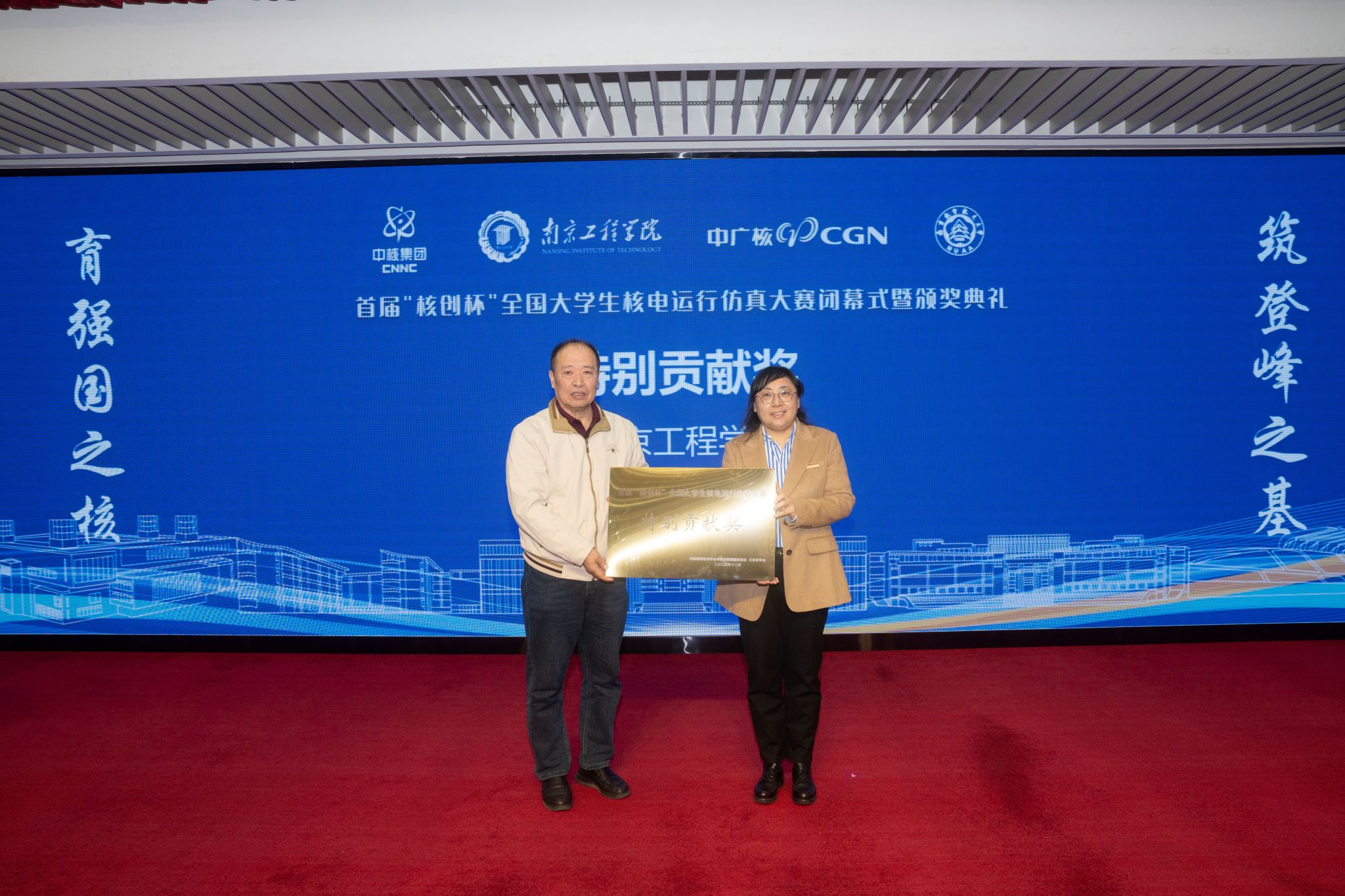 大赛设置理论考核与仿真实操环节,全面考察选手在核电安全运行、故障处理和团队协作等方面的综合能力。经过激烈角逐,最终评选出特等奖1项、一等奖2项、二等奖5项、三等奖8项。优秀组织奖由我校与南京航空航天大学共同获得,以表彰两校在赛事组织与推广中的突出贡献。闭幕式上,副校长朱松青宣读获奖名单,与会领导为获奖团队及个人颁奖。此外,我校因出色的赛事组织与服务工作,被授予“特别贡献奖”。
