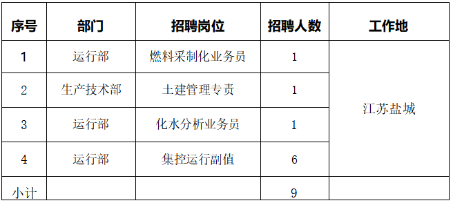 作为江苏省文明单位,公司始终践行“创新、协调、绿色、开放、共享”五大发展理念,致力于奉献清洁能源,打造国家千万千瓦级清洁煤发电示范基地;秉承“严、细、深、实”的工作理念,以“和创文化”建设为引领,倡导“盐蒿”精神和“金奖”精神,致力于“树国内百万机组标杆,创世界一流发电企业”目标愿景的实现。截至目前,已累计发电400亿千瓦时,机组主要经济技术指标在同类型机组对标中处于遥遥领先,盈利水平位居江苏省同规模火电企业前列。公司招聘岗位如下: