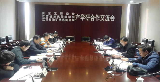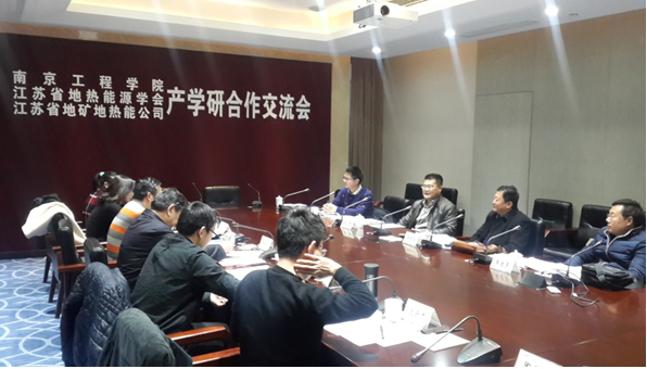 党委书记邓东华、副院长张君、暖通教研室主任陶爱荣和文先太博士参加交流会议,江苏省地热能源学会理事长杨增夫,秘书陶开宏,综合管理部长祝青、科宣部长史云杰、发展部长刘冰,江苏省地矿地热能有限公司副总经理刘加才、副总工程师李贵一同参加交流,会议由江苏省地矿地热能公司副总经理刘加才博士主持。