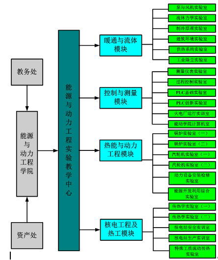 按照“统筹规划、优化资源、协调发展”的原则,对现有的5个模块、42个实验室进行调整,做好相应基础条件的配套,建立由学科科研型实验室、专业教学实验室和开放实验室组成的实验室体系。目前下设暖通与流体实验模块、热能与动力工程实验模块、控制与测量实验模块、核电工程与热工分析实验模块、电厂实训实践模块。包含各类实验室42个,实验室面积达到了4000m2,校外实习基地26个。拥有各种教学科研仪器设备1700余件,重要大型贵重和精密仪器设备三十余套,资产总值2200余万元。其中:承担的实验课程门数33门,实验项目数62个,年实验学生人数800余人,年实验人时数约5000小时。
