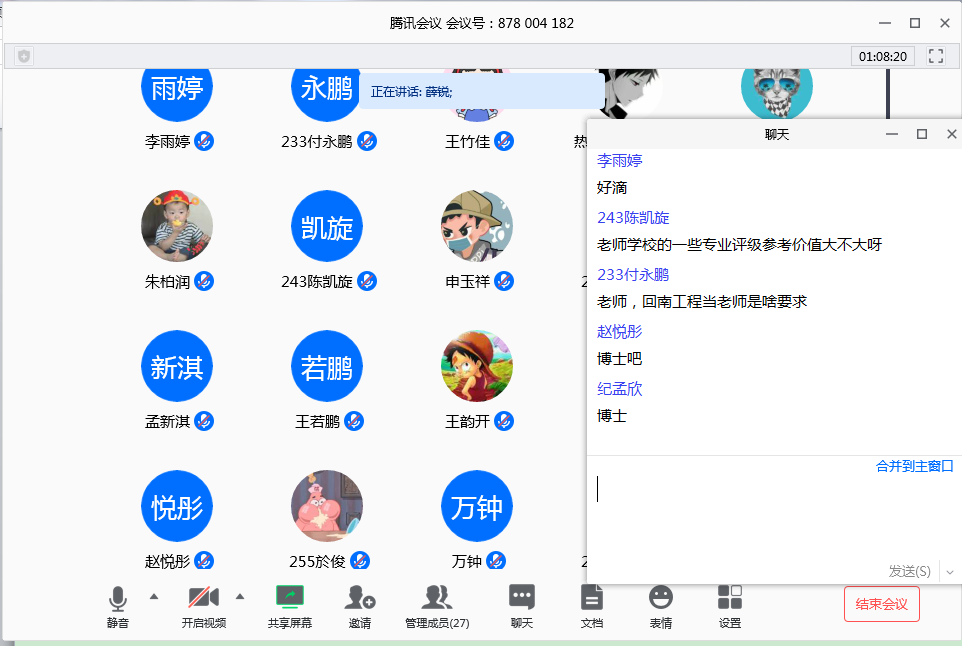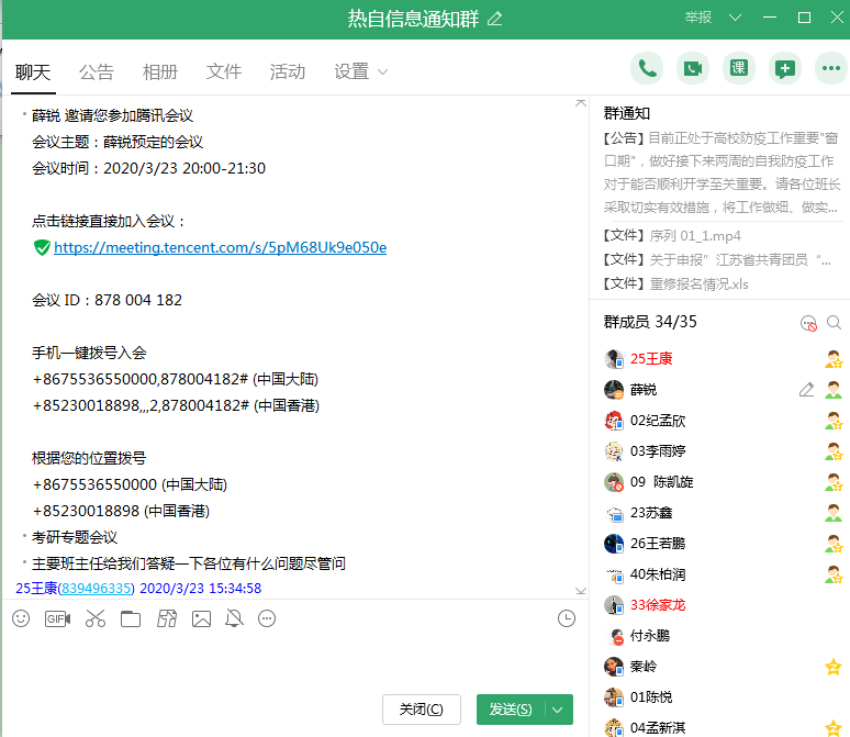 3月20日晚上8点,在班主任薛锐老师的带领下,热自171班级有意向参加2021年考研的27位同学齐聚“云端”——腾讯会议平台,召开了近90分钟的考研辅导专题班会。