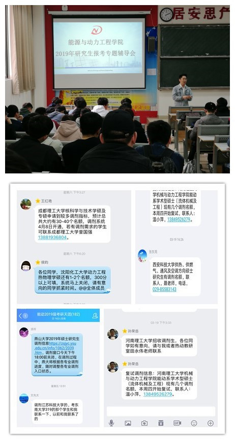 党政领导、各系主任、考研指导骨干教师、毕业设计指导老师、辅导员、班主任、班级就业信息员全员投入,七级联动。工作上契合、资源上整合、力量上联合,共同助力考研学生打好这一场“持久仗”、“硬仗”。“线上”建立专题辅导QQ群,充分发挥专业课老师在行业内的人脉和资源,实时发布第一手考研复试、调剂动态。截止目前已累计分享、发送2019届毕业生考研有效信息200余条;“线下”召开考研复试(调剂)专项辅导会、组织老师“一对一”复试辅导,指导学生科学制定有效策略。