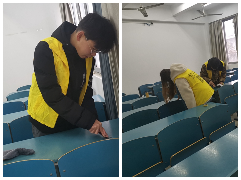 组织青年学生以团支部为单位,发挥先进团支部的榜样作用,开展PPT课件制作、上课黑板清洁、上课教室清扫、课堂笔记分享等方面的志愿服务。志愿者提前进入教室,为教师开启电脑及投影仪,减少课前准备时间;课间,志愿者及时清洁黑板,保证教学活动的顺利进行;课后,志愿者整理讲台、打扫课桌,让教室保持干净整洁,并在所有同学离开教室后关闭电灯电源,践行节能减排倡导。