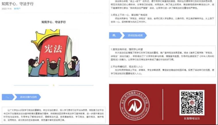 将结合学习宣传党的二十大精神和纪念现行宪法公布施行四十周年等内容,不断推进宪法学习宣传教育,弘扬宪法精神,维护宪法权威,继续营造学习宪法、尊崇宪法、维护宪法的浓厚氛围,创造“知法、懂法、守法、用法”的校园环境,助力大学生全面发展。